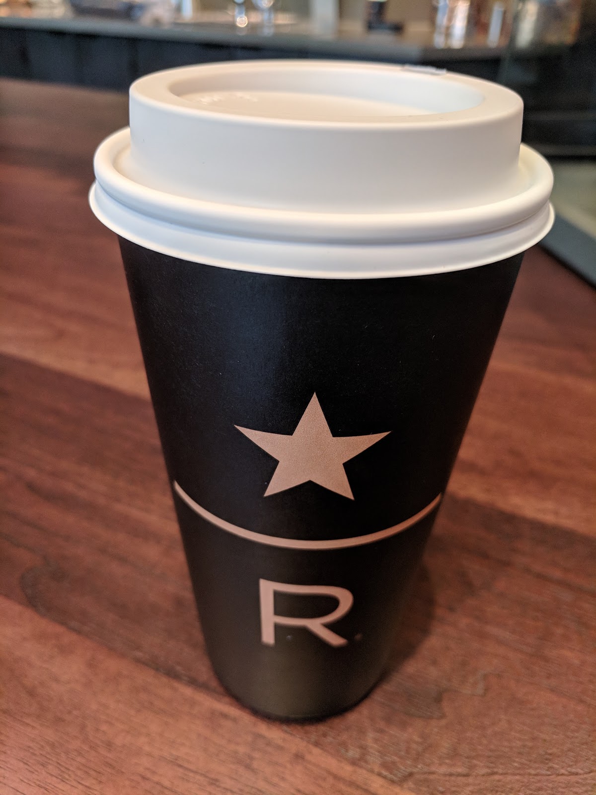 Since I got my coffee to-go, it came in a paper cup, but if I were planning to consume it there, it would have come in a real glass. Still, no standard Starbucks cup here, the dark color and logo matched the feel of the entire place, far more classy. My barista apologized that she had no matching reserve lids, and had to settle for the white one.